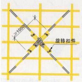 下图是脚手架剪刀撑的搭接示意图,下面关于其设置描述正确的是:()